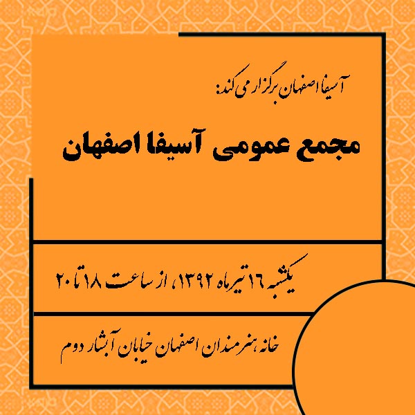 مجمع عمومی آسیفا اصفهان در سال ۹۲ یکشنبه ۱۶ تیرماه از ساعت ۱۸ تا ۲۰ در خانه هنرمندان اصفهان برگزار می گردد.