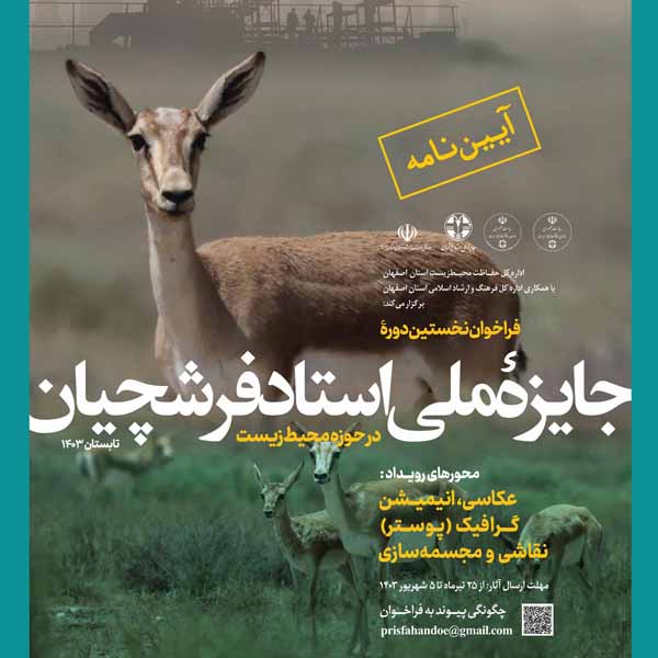 گرافیک(پوستر)، عکاسی (با گوشی یا دوربین)، انیمیشن، نقاشی و مجسمه و یادمان از محورهای نخستین دوره جایزه ملی استاد فرشچیان در حوزه محیط زیست است و اختتامیه این رویداد در شهریور سال جاری برگزار خواهد شد.